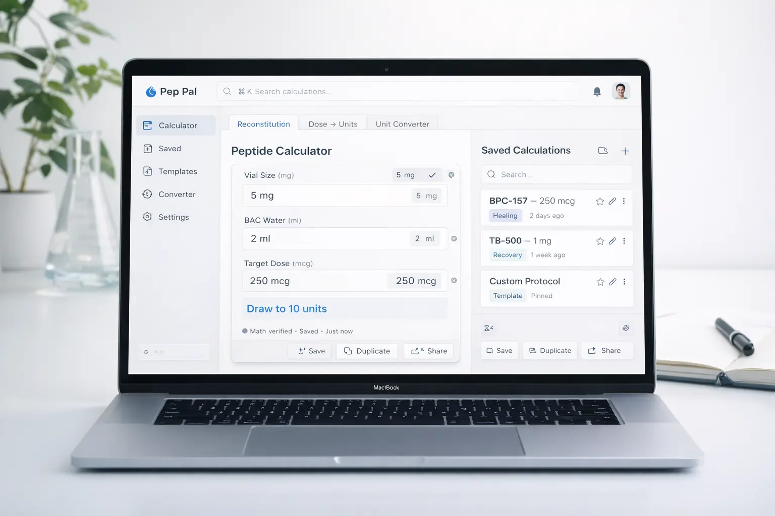 See the precise number of units to pull on your syringe. PepPal Premium is coming soon with saved calculations, custom names, and notes. Join the waitlist for early access.